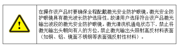 根據(jù)歐洲標(biāo)準(zhǔn)EN 60825-1,條款9,該設(shè)備內(nèi)部激光器屬于4類激光器。該產(chǎn)品發(fā)出波長(zhǎng)在1064nm或1080nm附近的激光輻射,且由于輸出頭輻射出的平均功率大于150W,會(huì)對(duì)直接或間接地暴露于這樣的光強(qiáng)度下的眼睛和皮膚造成傷害。盡管該輻射不可見,光束仍會(huì)對(duì)視網(wǎng)膜或眼角膜造成不可恢復(fù)的傷害。在激光器運(yùn)行時(shí)必須佩帶合適且經(jīng)過(guò)認(rèn)證的激光防護(hù)眼鏡。